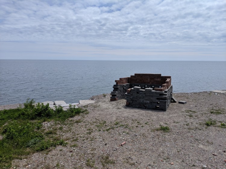I visited The Leslie Spit on my own this past summer, and was barred from crossing the ‘floating bridge’ that connects the northeast part of the park to the southwestern peninsula – the lake had risen to a dangerous level, and the path was flooded. I doubled back and wound through paved and beaten paths until I found myself suddenly exposed to the waterfront, surrounded by piles of discarded brick. The scene struck me as some surreal kind of playground, like an oddly rendered Minecraft map**. Someone (or someones) had even built up a bit of a brick structure, overlooking the cliff out towards Lake Ontario. It seemed like people, similar to the birds, had been left to play how they see fit.