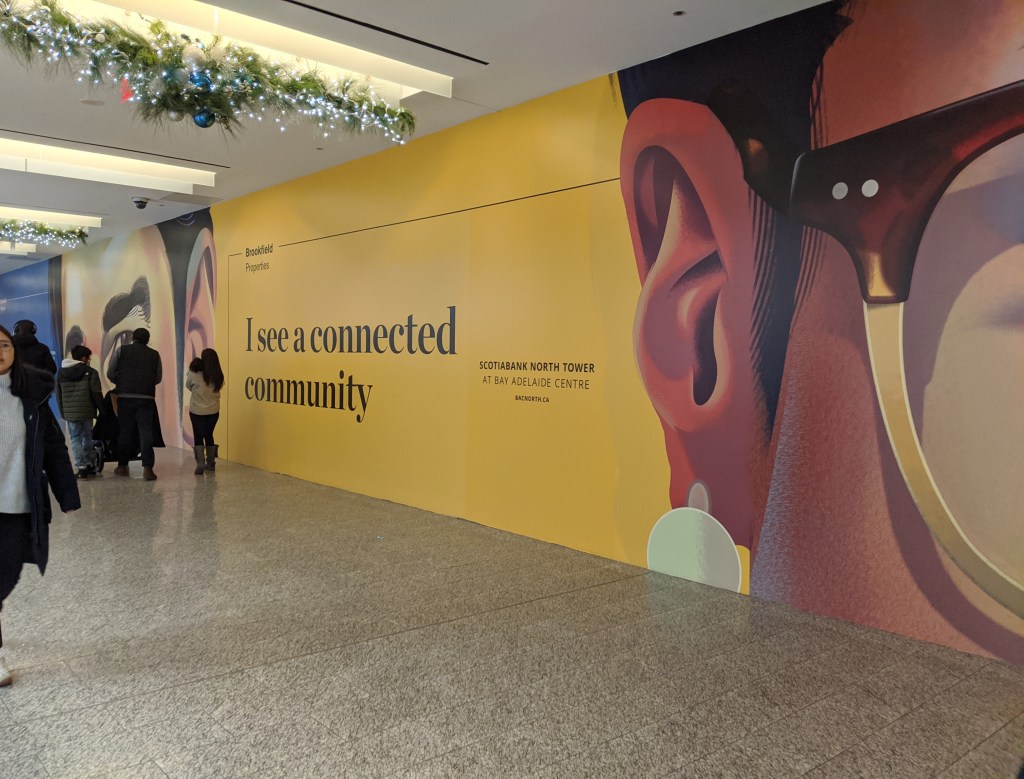 The diversity of the PATH astounds me. I wander through grubby food courts, upscale shopping markets, strip malls, and subway tunnels, each place with a different personality. However, other geographies arise, as well – just outside the Hudson’s Bay Company, which strikes me as more of an assemblage of upscale markets and businesses, I spot two security guards looming over someone in a wheelchair, who is panhandling for change. Farther along my journey, I come across advertisements posted by Brookfield Properties, which pose the question “Do you see, what we see?”.
